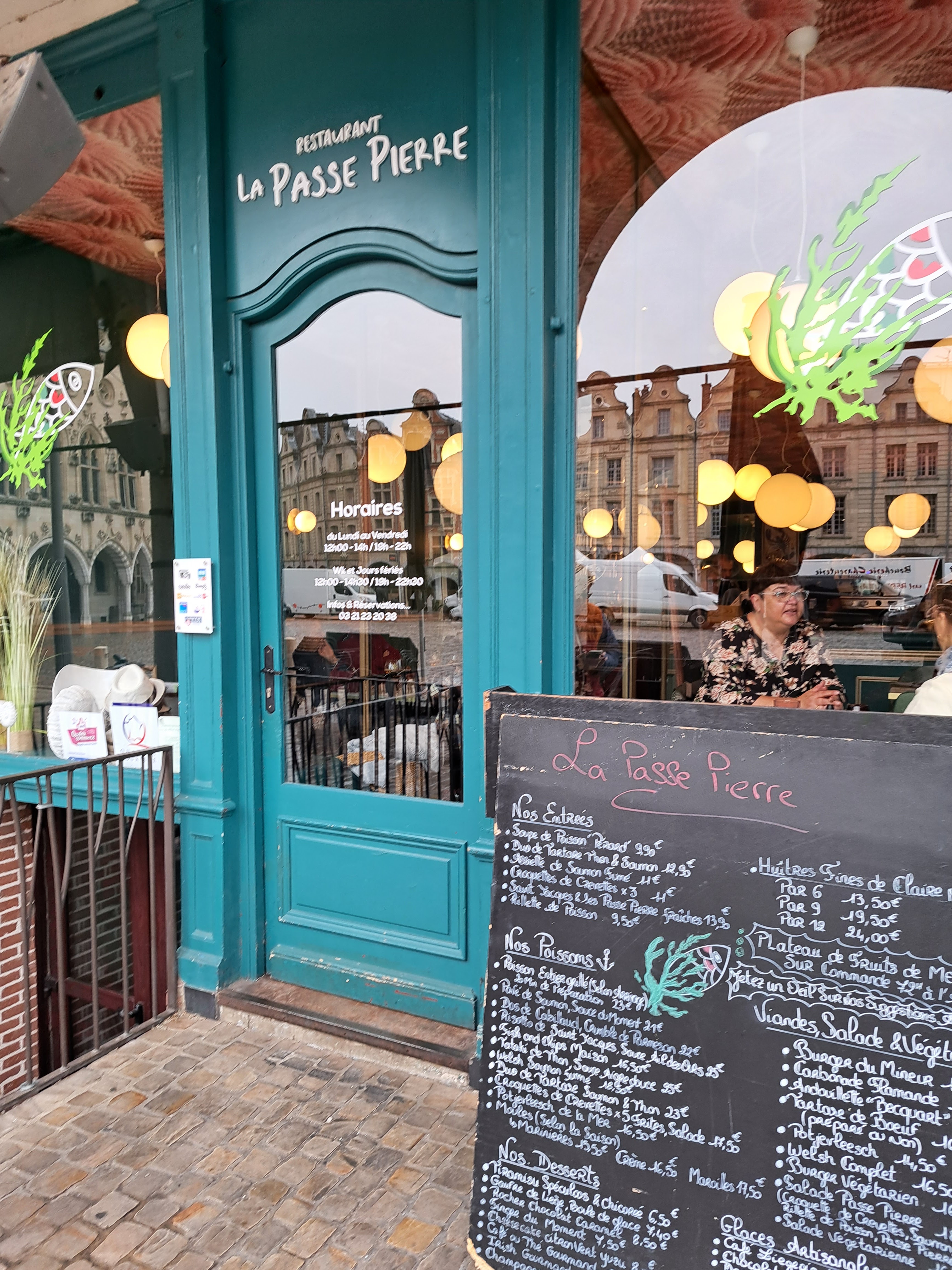 Très joli décor sur la plus jolie place de la ville ! Accueil ok (pour une réservation à l'extérieur impossible) qui s'est transformé en un très bon service. Nous avons pris une planche de la mer à partager : saumon bon mais pas transcendant, terrine ok (un peu aqueuse), très bonnes croquettes de crevettes et salicornes. Nous avons ensuite mangé d'excellents tempuras (beignets) de Saint Jacques avec leur sauce (base mayonnaise mais pas maison) et salicornes ET un cannelloni de saumon fourré à l'avocat (un peu décevant et presque trompeur) avec son coulis de betterave. Les desserts ont quant à eux été une réussite : un somptueux tiramisu revisité (spéculos et chicorée) et une soupe de fraise avec sa glace ! Malgré un prix un peu élevé, je recommande la Passe Pierre, notamment pour changer des plats traditionnels régionaux, bons mais un peu trop riches, et découvrir des plats adaptés aux ingrédients du Nord...