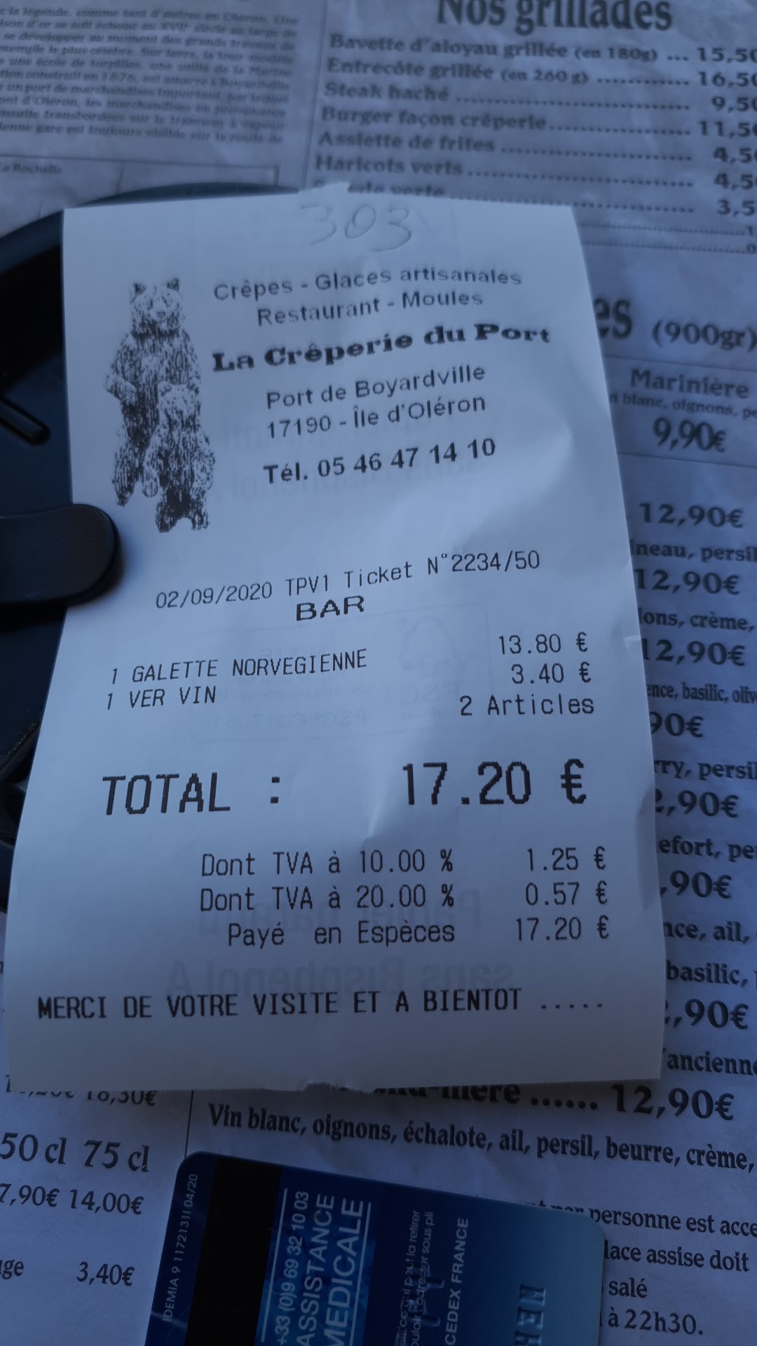 Nous sommes arrivées avec ma fille à 11h45 pour manger car nous devions aller visiter le fort boyard en bateau à 13h. Notre serveuse était au courant et s'est demenée pour que nous puissions manger rapidement. N'avons eu hélas le temps de ne manger qu'une assiette copieuse de bulots et une glace accompagnés d'un verre d aperirif local (très bon) Nous avons passées un agréable moment. Merci à vous