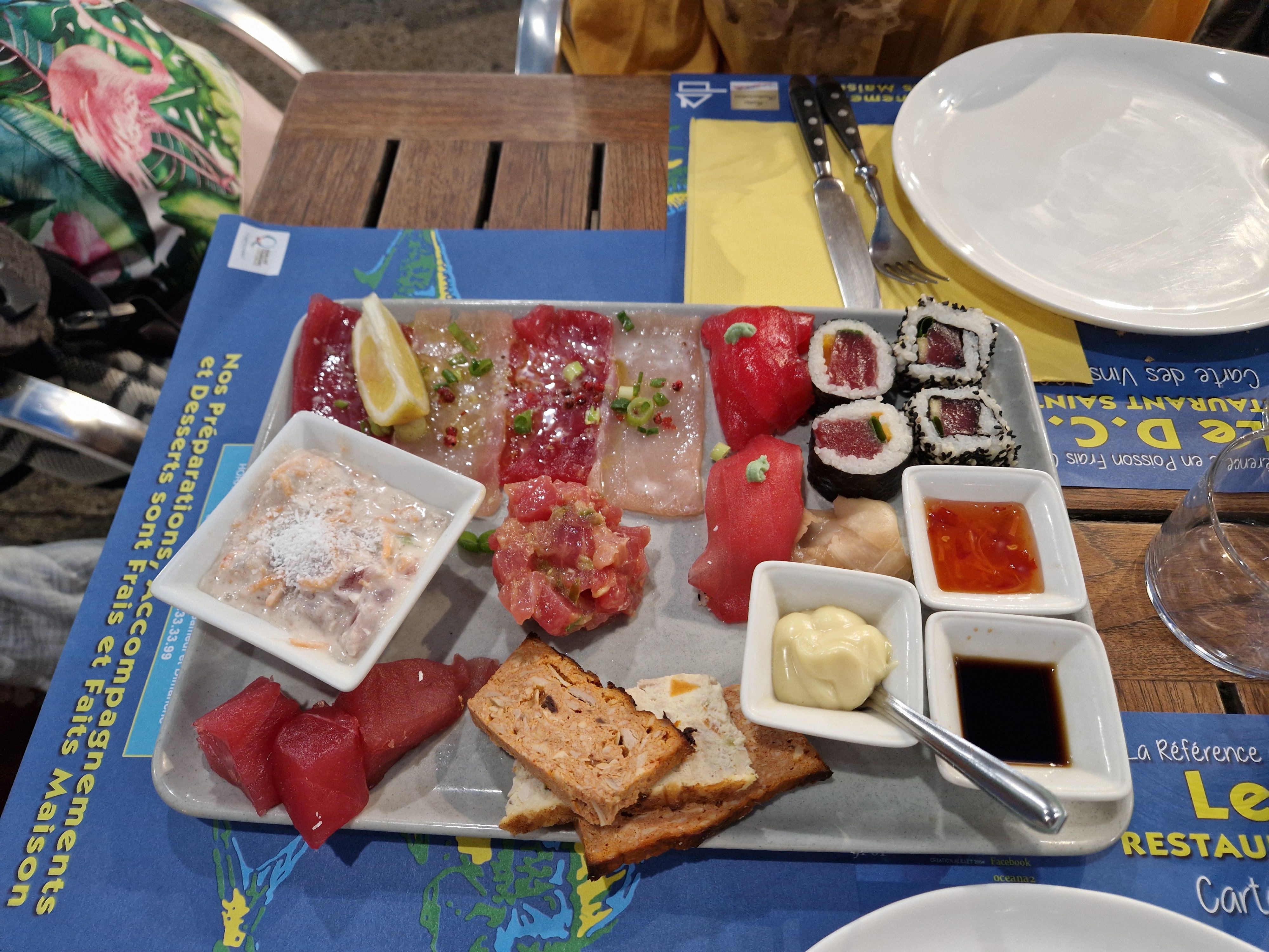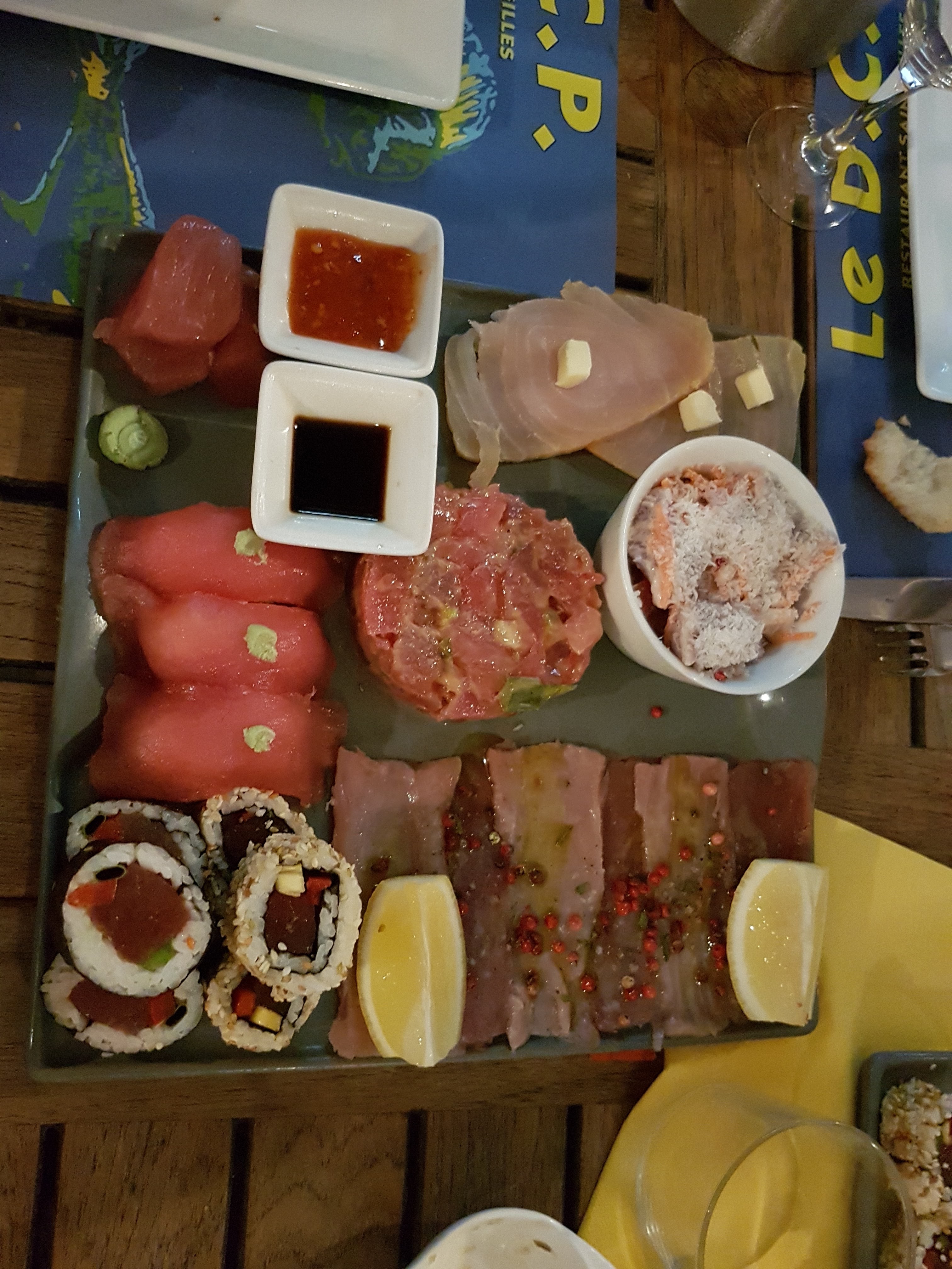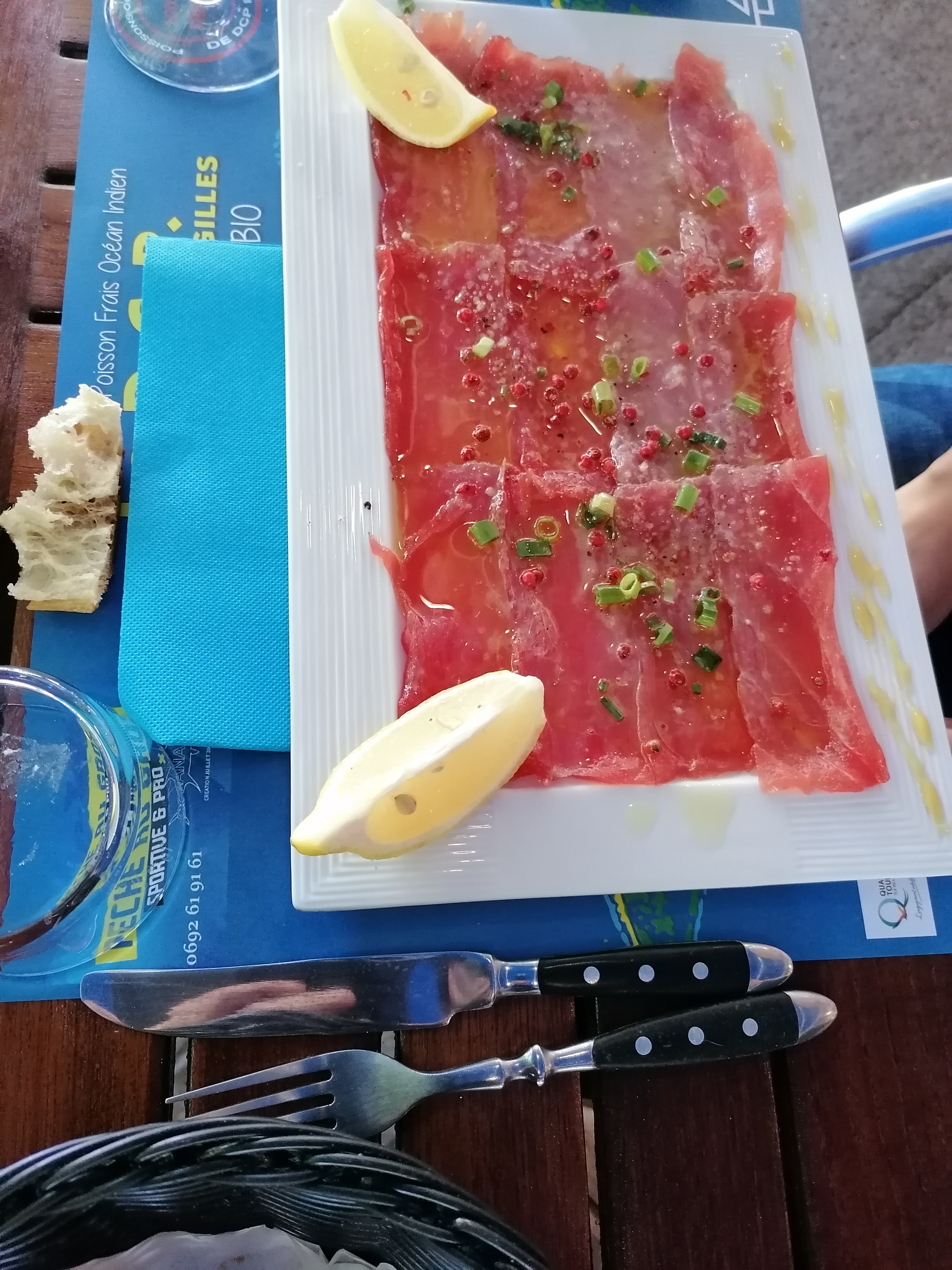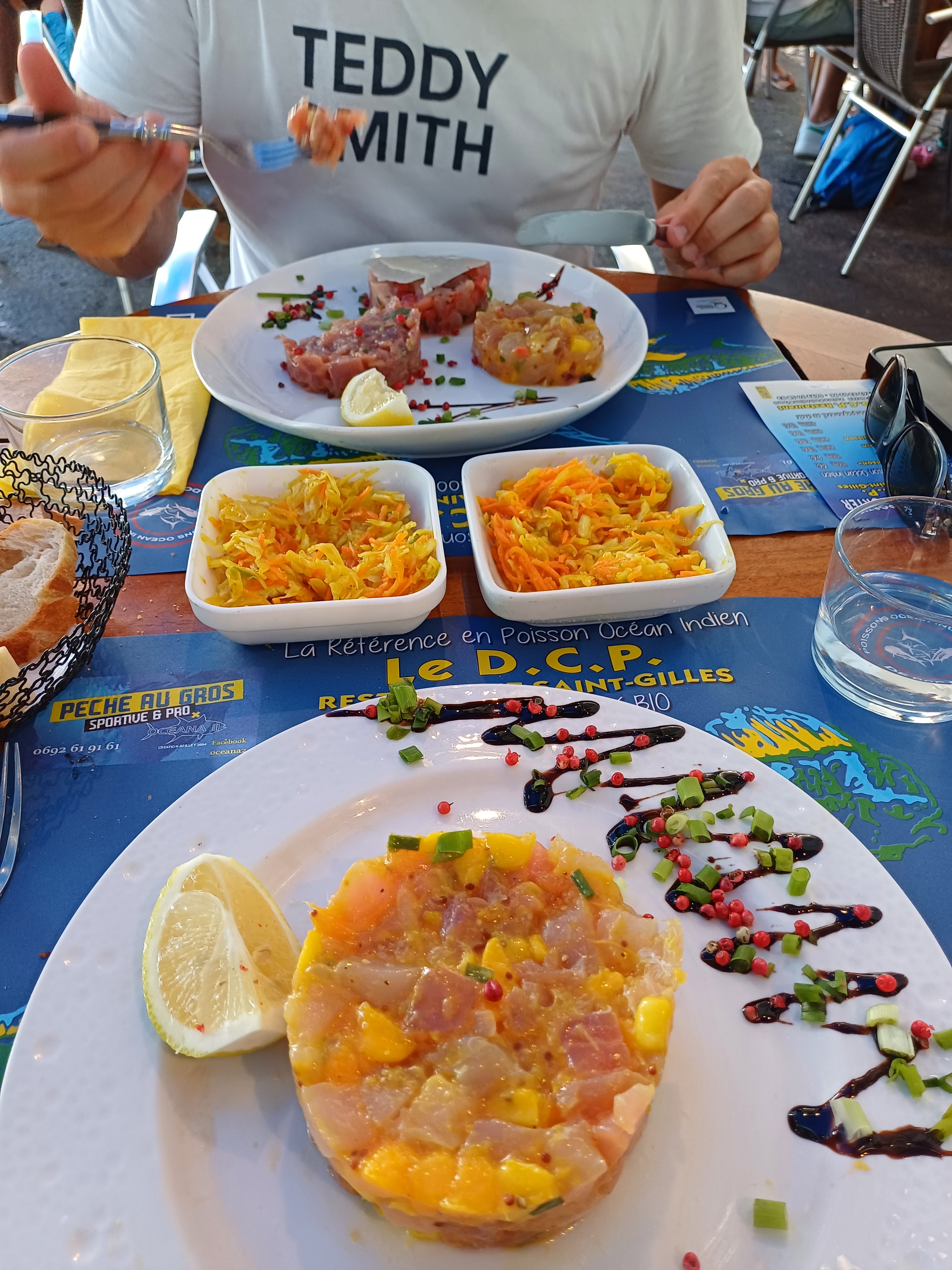 Magnifique. Après une dure journée à me faire cuire sous le soleil de saint-Gilles, je suis tombé nez à nez avec un marlin géant. Une jeune femme hyper sympa au service m’a suggéré l’assiette expert en poisson cru, 500g à déguster. Top de chez top. Direct au lit après ce délice. Félicitations à Jean-Christophe qui en plus d’avoir un super prénom à une equipe des plus sympathiques. À bientôt.
