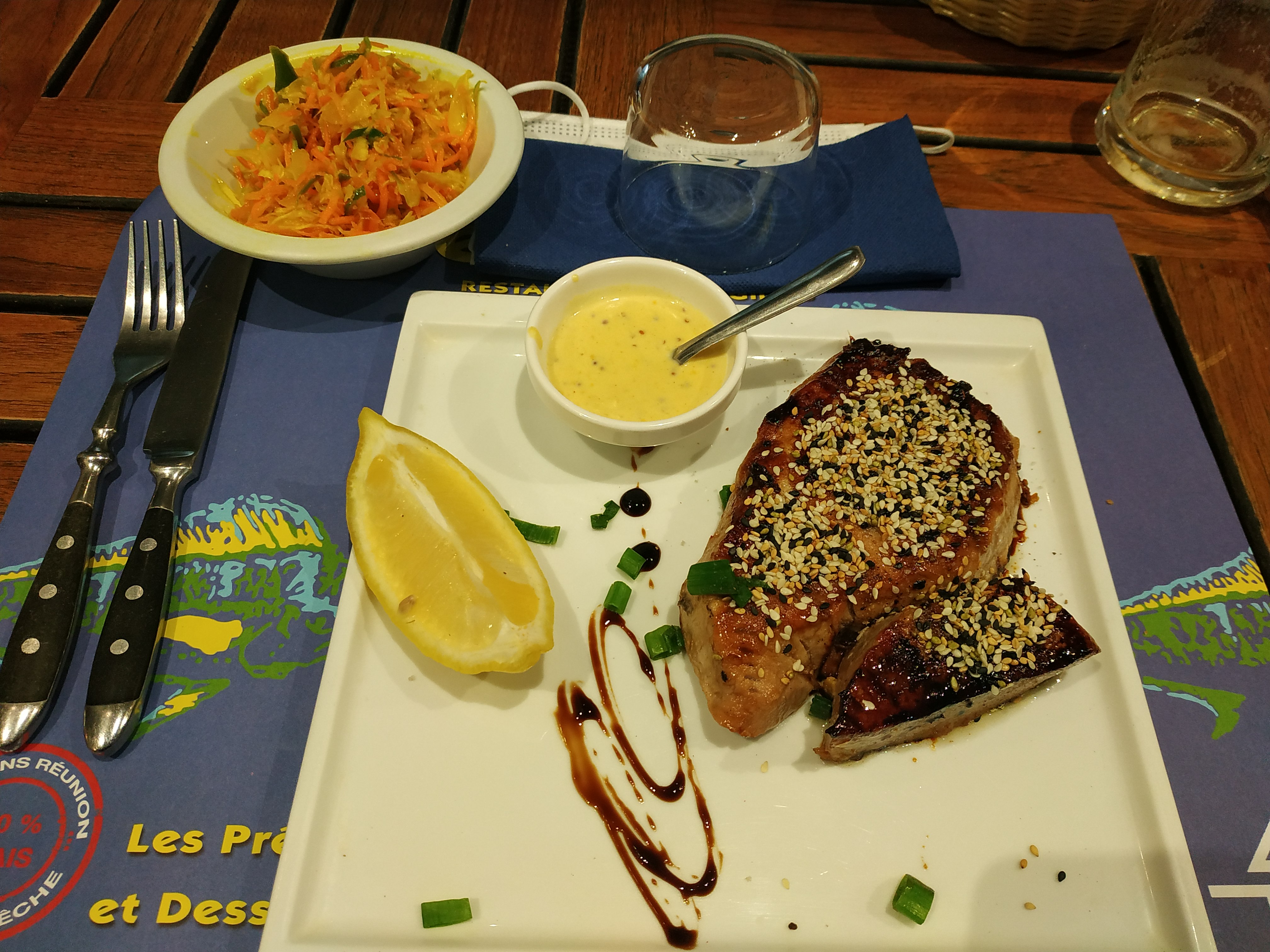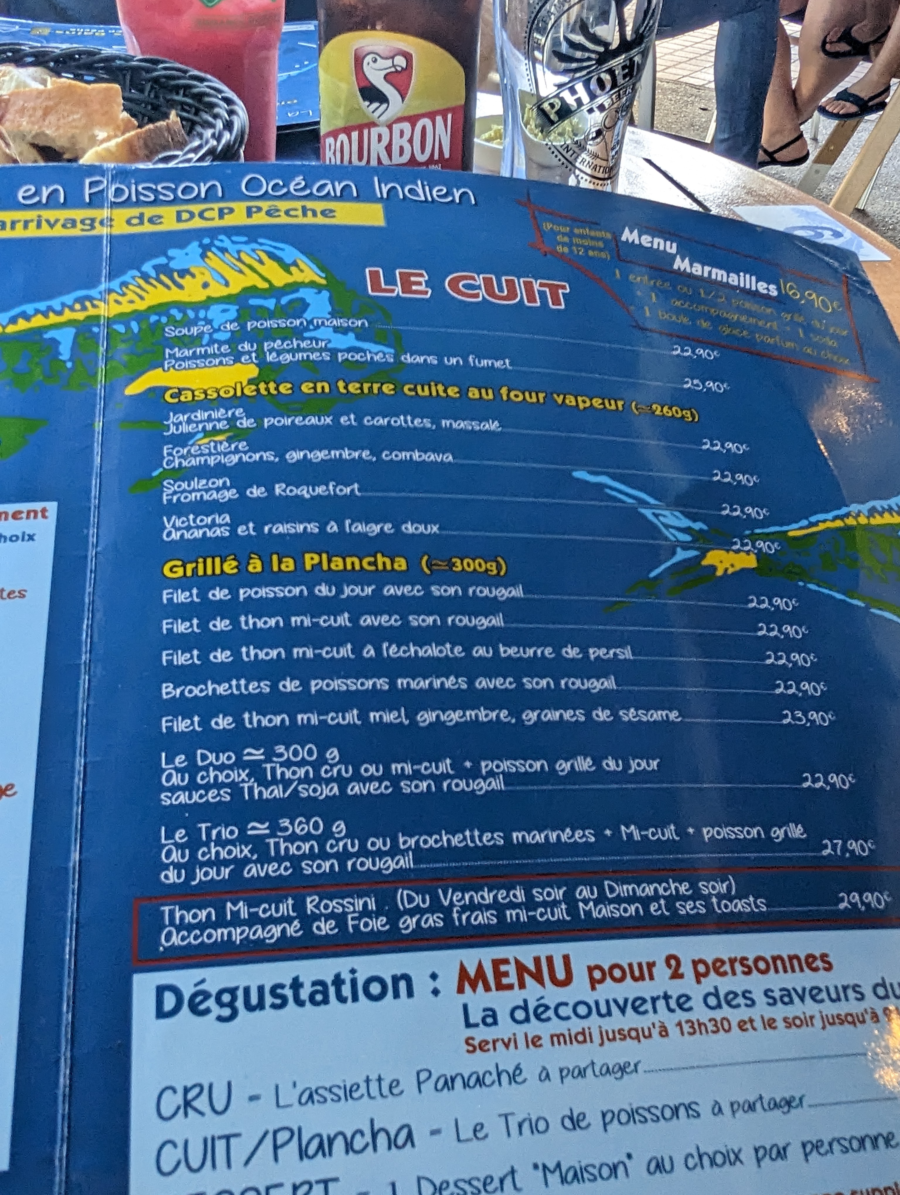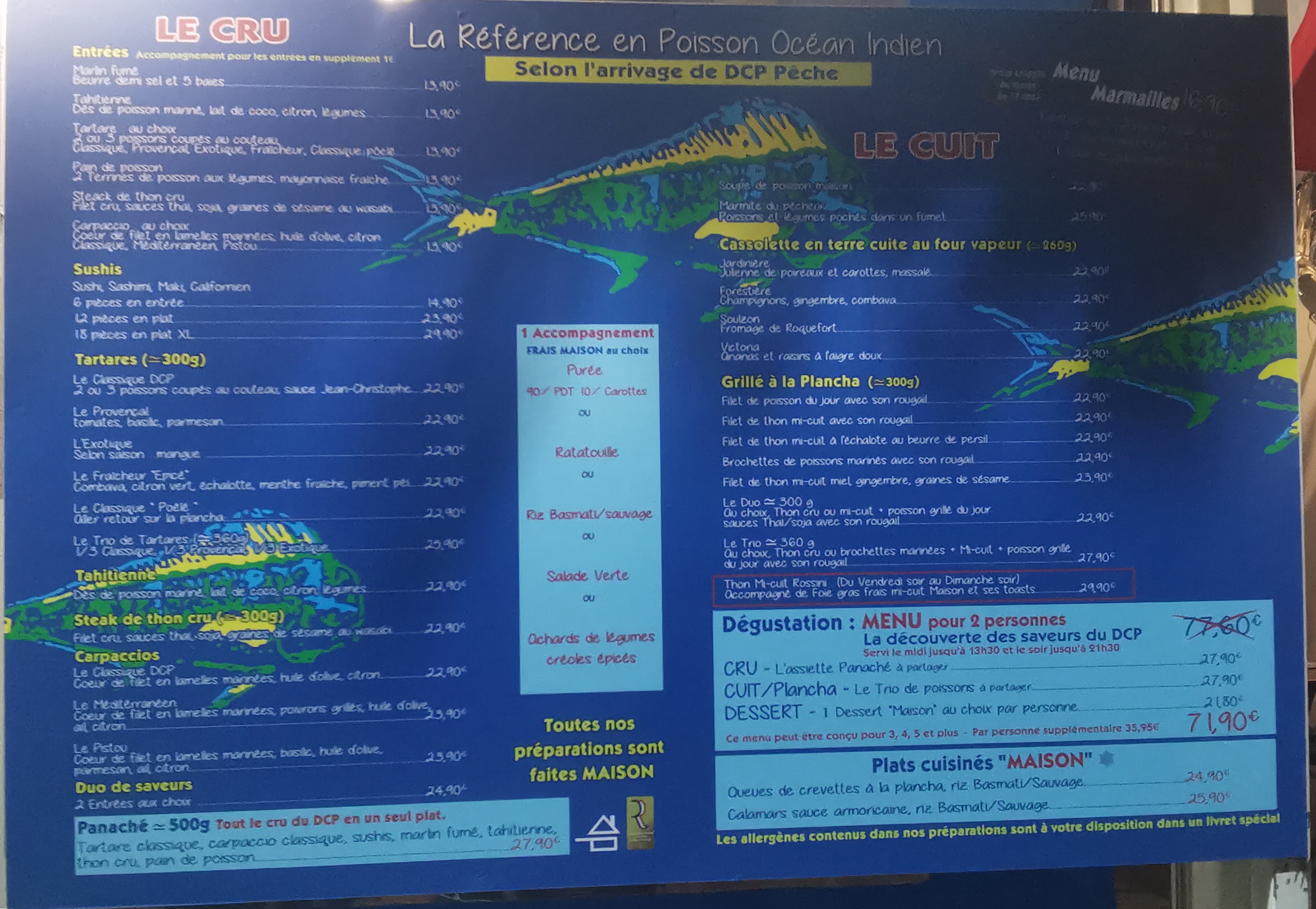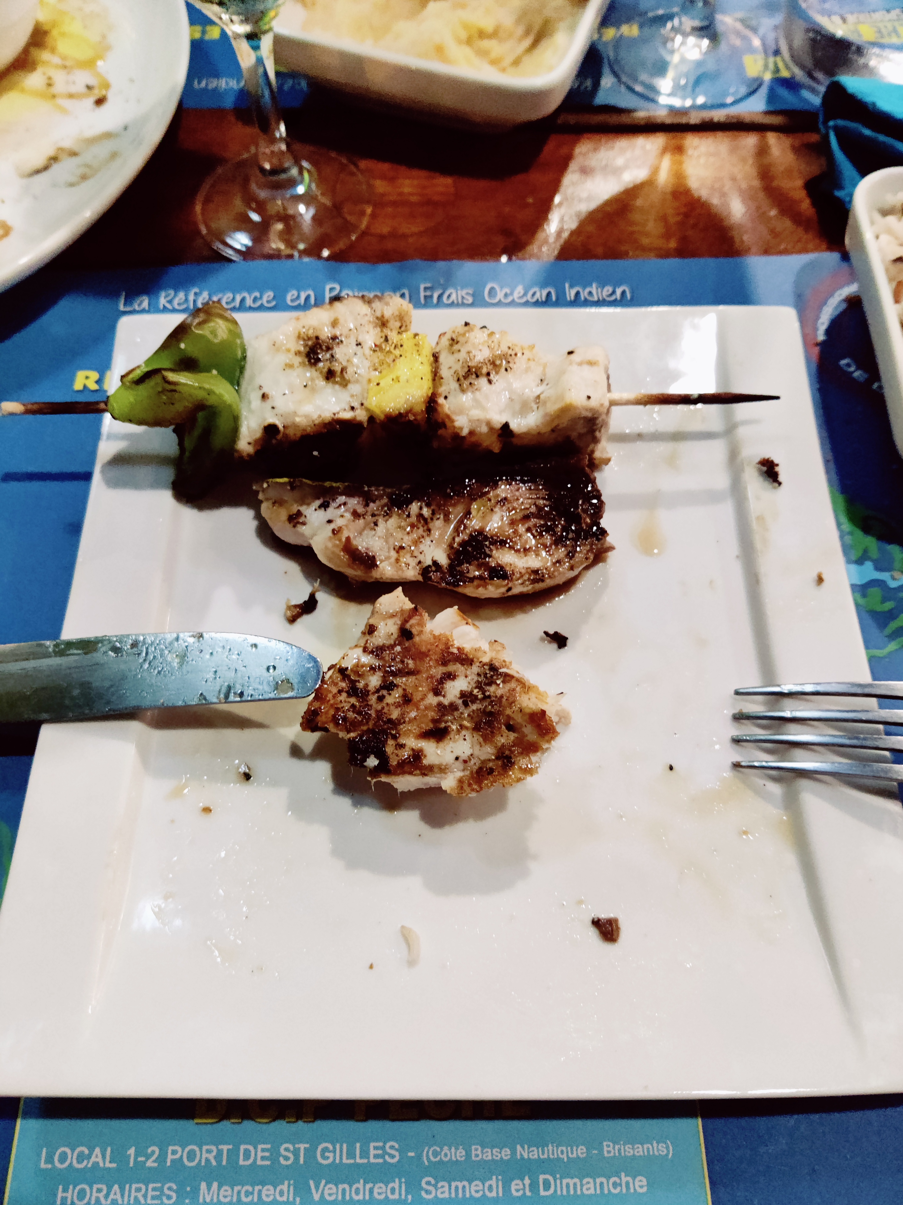 Magnifique. Après une dure journée à me faire cuire sous le soleil de saint-Gilles, je suis tombé nez à nez avec un marlin géant. Une jeune femme hyper sympa au service m’a suggéré l’assiette expert en poisson cru, 500g à déguster. Top de chez top. Direct au lit après ce délice. Félicitations à Jean-Christophe qui en plus d’avoir un super prénom à une equipe des plus sympathiques. À bientôt.