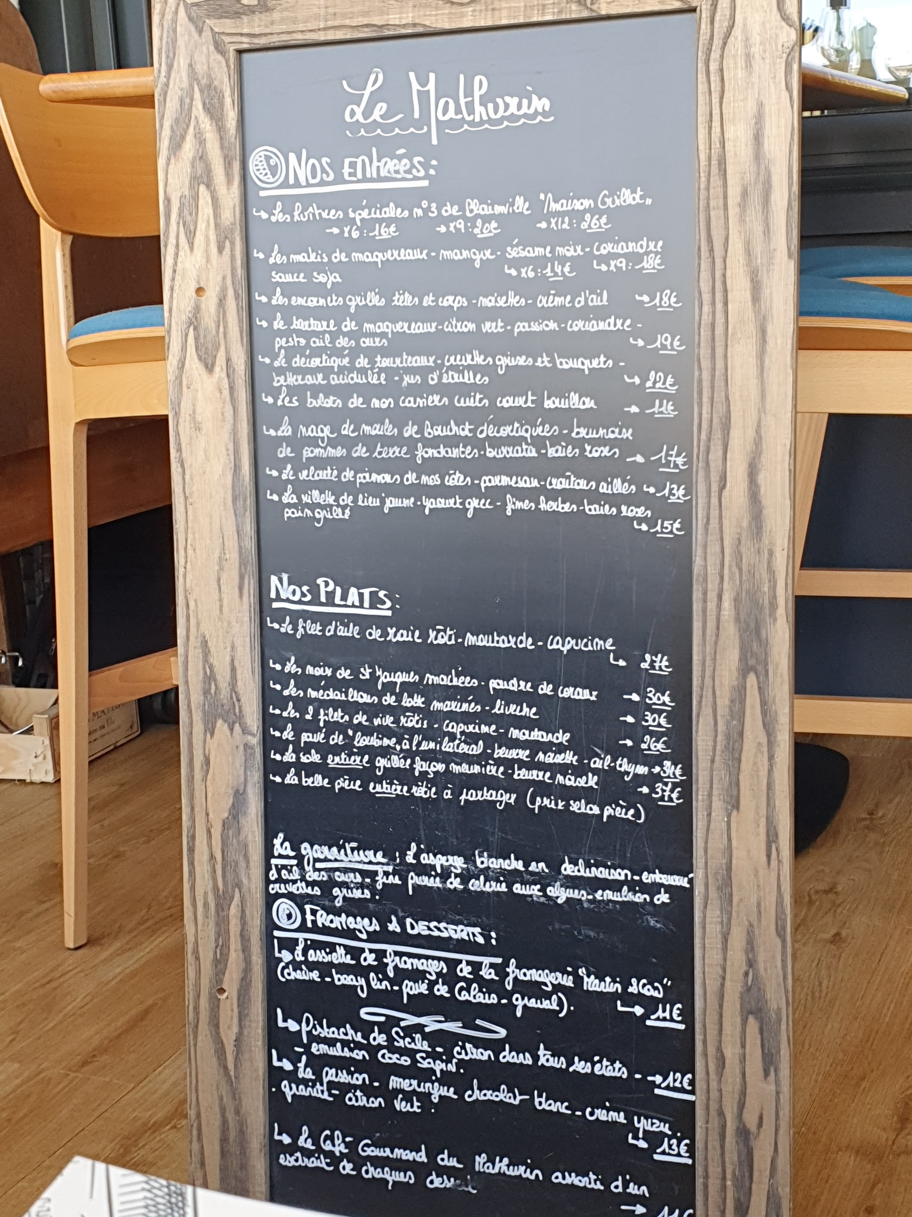 Nous avons dîné le 2 août au mathurin. Réservation pour 20h30 notre table nous attendait. Accueil chaleureux, service parfait 👌. Une vrai découverte exceptionnelle !! Pas de carte car les plats dépendent de la pêche du jour, fraîcheur garantie. Plats élaborés, goûteux et esthétique. Le poisson est excellent les associations de saveurs parfaitement orchestrées. Bravo au chef pour la beauté des assiettes. Nous avons passé un moment exceptionnel ! à faire absolument si vous venez en baie de Somme. Nous sommes prêt à refaire 3h de route juste pour avoir le bonheur de goûter les plat du jour.